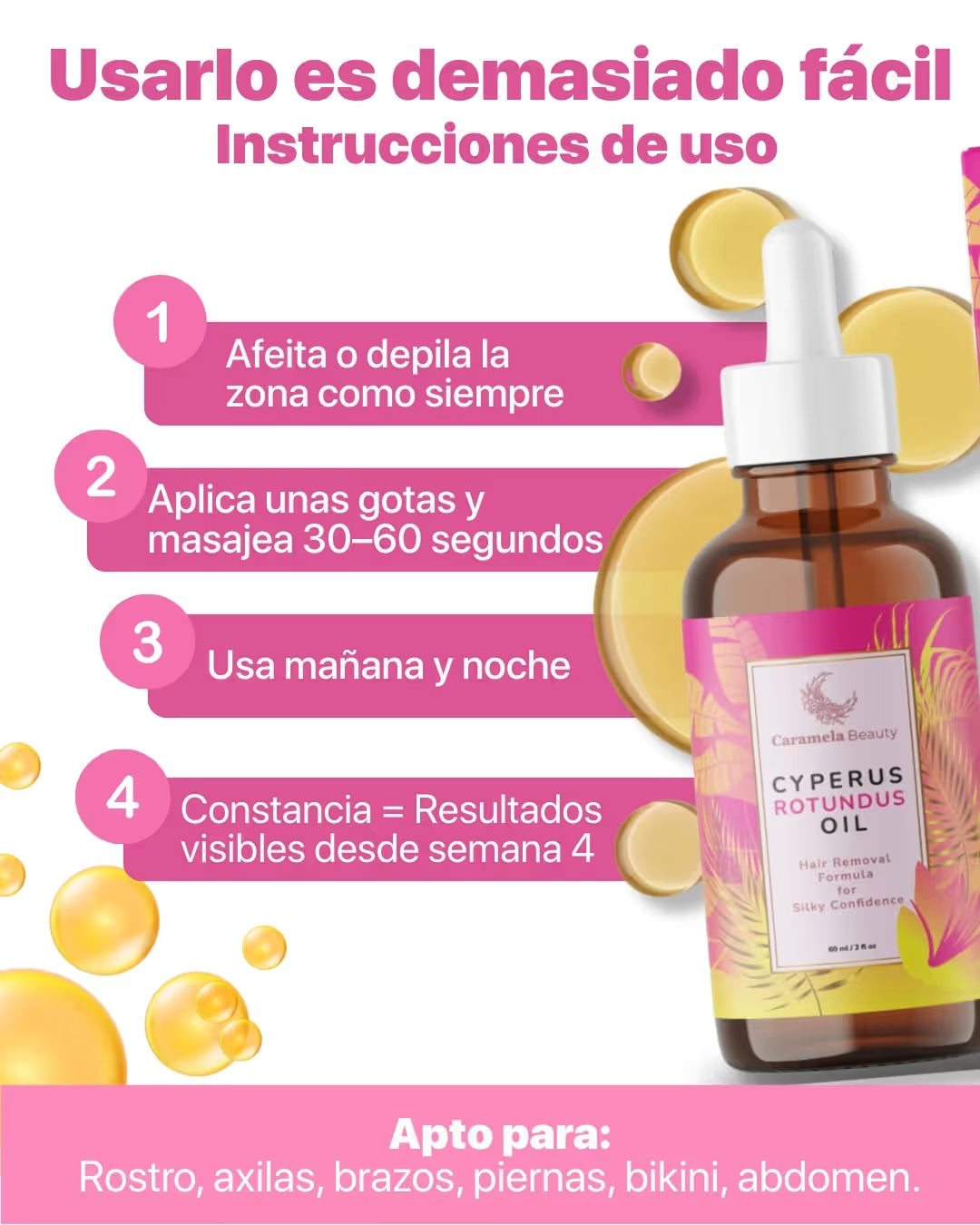 Lo uso como aceite post-afeitado en el área del bikini y estoy feliz. El vello no vuelve grueso ni oscuro, crece lento y ya no tengo pelos encarnados. 🔥💕Carla Ramirez. -